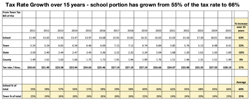 In 2025, about 66% of our property-tax rate is attributable to the school, compared to roughly 23% for town government. The number of full-time employees (FTEs) has grown from 39 to 49, at a time when enrollment has decreased. School-budget decisions are, in practical terms, decisions about two-thirds of our property-tax burden.